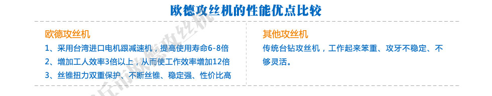 安丘市歐德機械有限公司是山東省有名的電動攻絲機生產研發制造企業,公司常年對外供應多種數控攻絲機產品并提供相應的技術指導和售后服務,公司發展進取氣動攻絲機制造技術,在螺紋鋼上絲機產品技術層面獲得多次改進,公司的鋼筋上絲機產品質量也發生了質的飛躍。